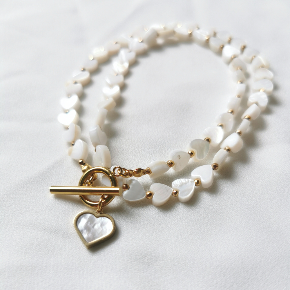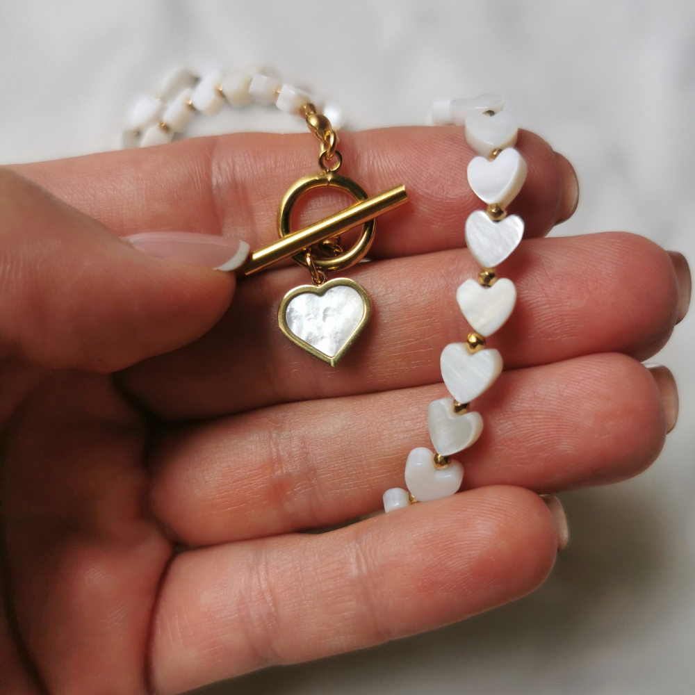 Ręcznie robiony naszyjnik z koralików wykonanych z masy perłowych w uroczym kształcie serduszek, przełożone hematytowymi kuleczkami w kolorze złotym. Ozdobne zapięcie typu toggle ze stali chirurgicznej w kolorze złota. Całość wieńczy zawieszka ze stali chirurgicznej i masy perłowej w kształcie serduszka