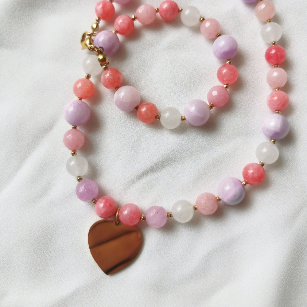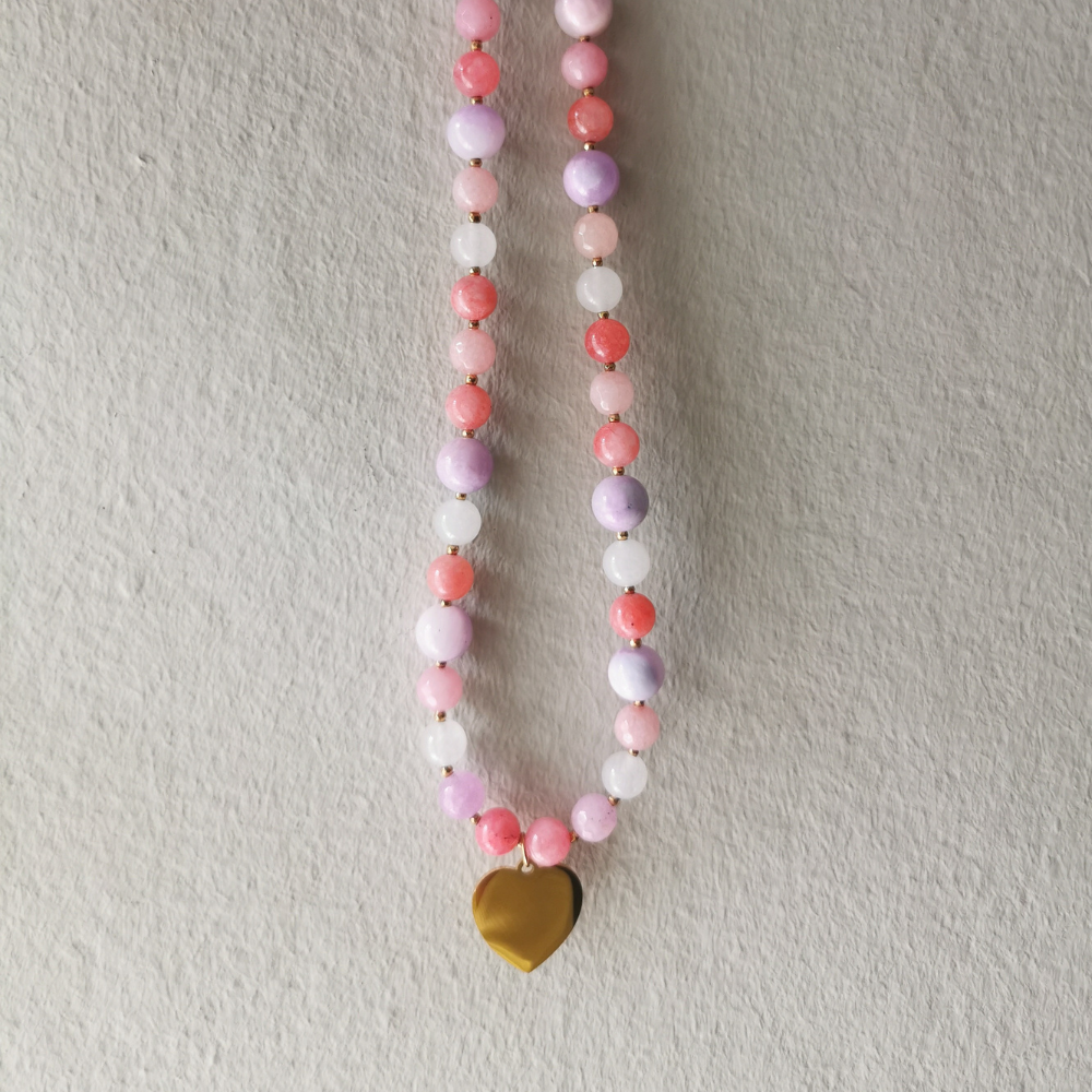 Naszyjnik składa się z kulistych kamieni naturalnych (jadeit, agat, marmur) w odcieniach różu, lila, fioletu i mlecznej bieli, przeplatanych drobnymi złotymi kuleczkami z hematytu. Całość wieńczy efektowna zawieszka w kształcie serca ze stali chirurgicznej w złotym kolorze, dodając romantycznego charakteru.