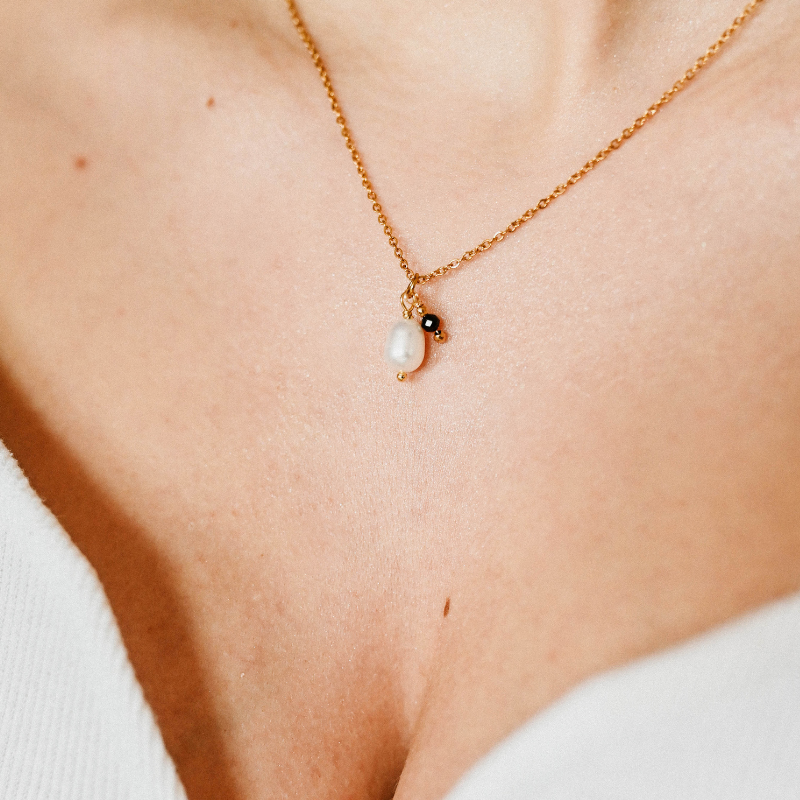 Kobiecy łańcuszek z naturalną perełką i malutkim czarnym koralikiem.
